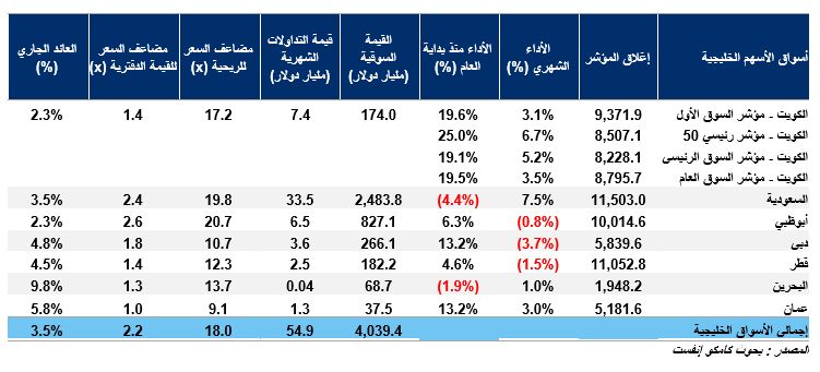 وجاءت السعودية في صدارة الأسواق الخليجية الأفضل أداءً خلال الشهر بمكاسب بلغت نسبتها 7.5%، لتكون ضمن أعلى المؤشرات المالية على مستوى العالم.