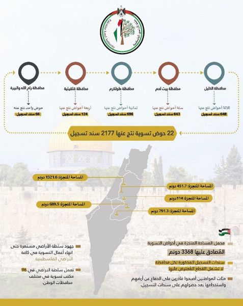 وبلغت المساحة الكلية المُصادق عليها من قاضي التسوية لهذه الأحواض 3368 دونما موزعة على المحافظات الخمس، وفق بيان صادر عن سلطة الأراضي، حيث بلغت المساحات المُنجزة في محافظة الخليل 791.3 دونم، وفي محافظة بيت لحم 689.5 دونم، وفي محافظة طولكرم 1321.6 دونم، وفي محافظة قلقيلية 451.7 دونم، وفي محافظة رام الله والبيرة 114 دونماً.