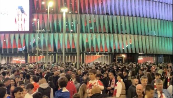 ووقفت الجماهير الغفيرة (47 ألف متفرج) التي احتشدت في مدرجات ملعب سان ماميس لتحيتهم بتصفيق حار ومؤثر، حيث رفعت خلال الفعالية شعارات "أتلتيك مع فلسطين.. أوقفوا الإبادة"، وهتفت لفلسطين.