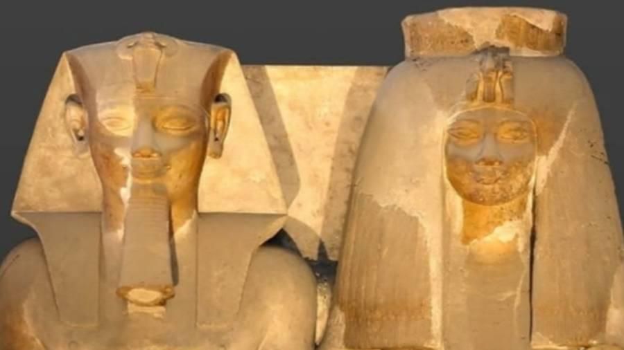 يعرض المتحف المصري بالتحرير تمثالاً ضخماً للملك أمنحتب الثالث وزوجته الملكة تي.