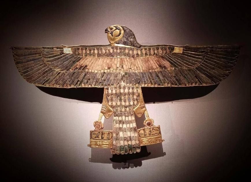 وتعد القلادة إحدى القطع الأثرية الفريدة مذهلة في طريقة صنعها والمواد المستخدمة، حيث صُنعت على هيئة صقر ذي جناحين ممدودين وتحمل اسم الملك آمون إم أوبت من الأسرة الحادية والعشرين.